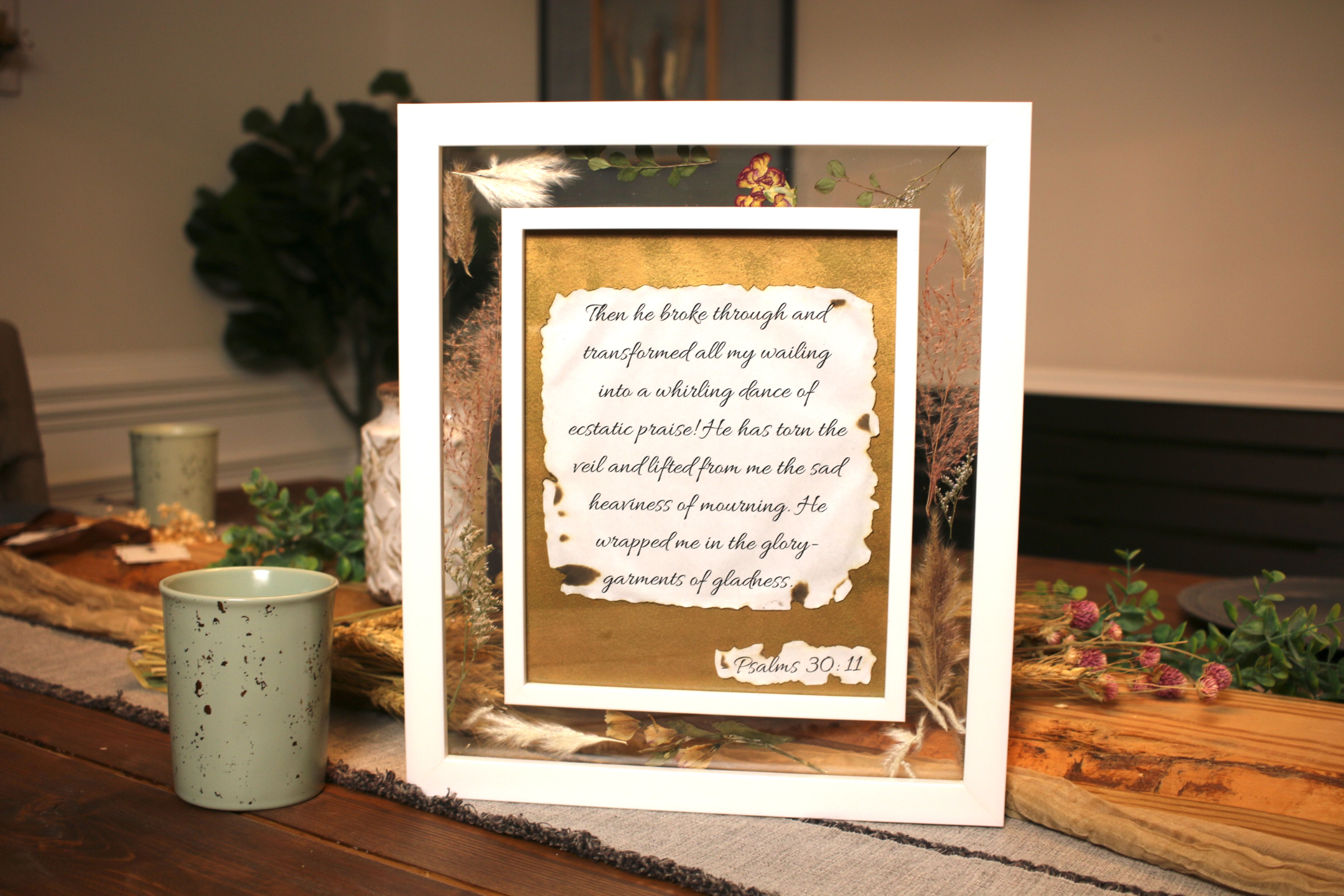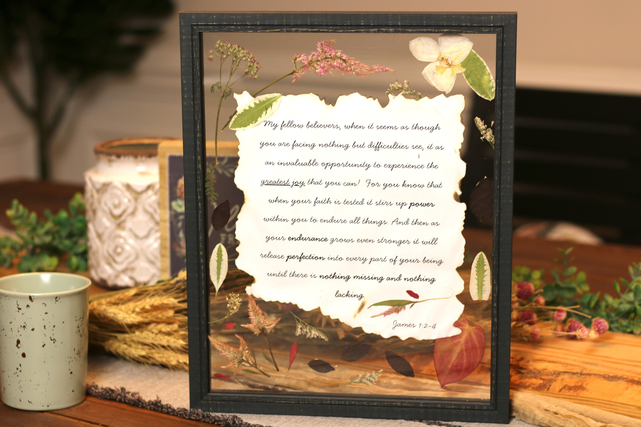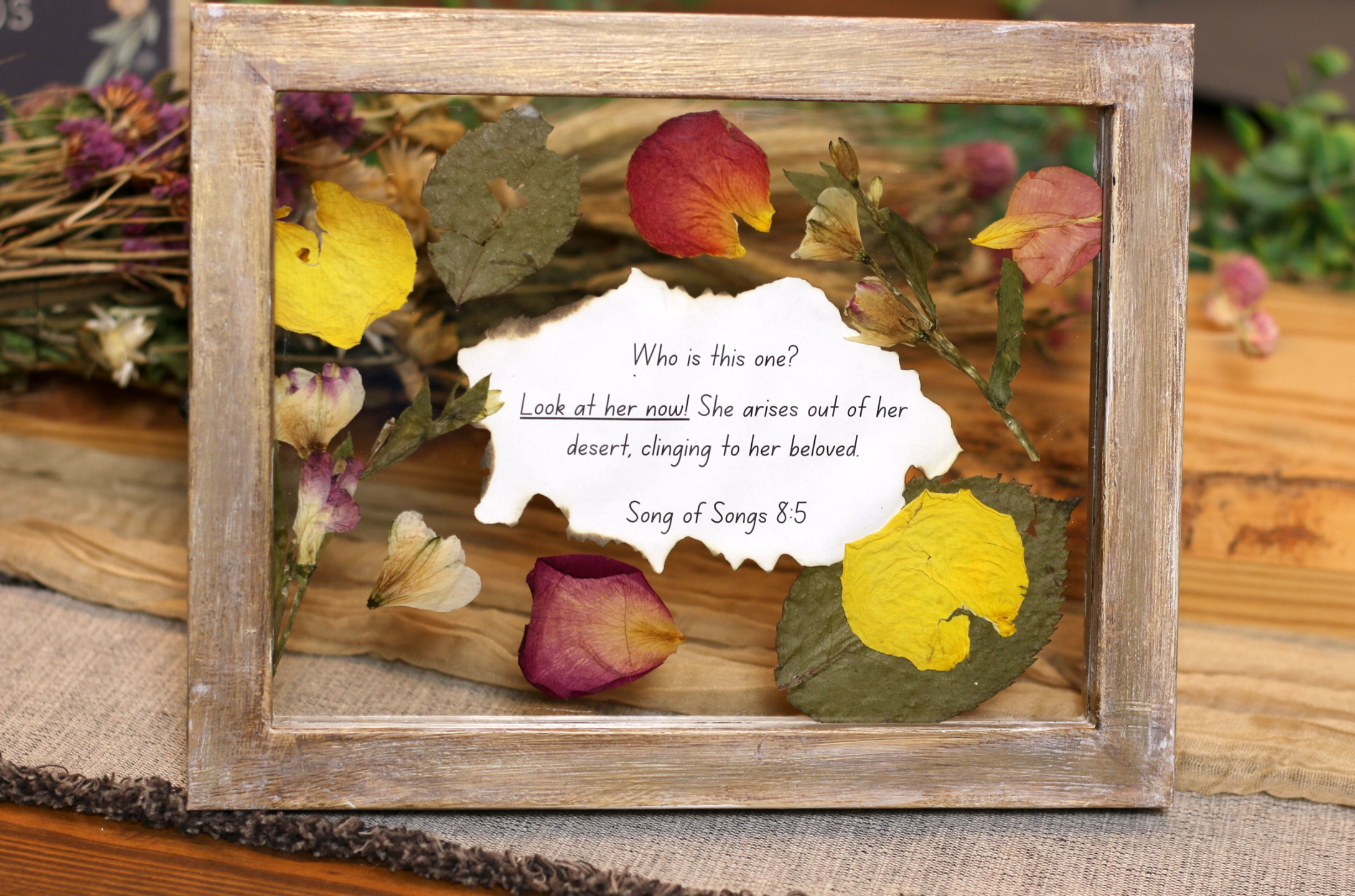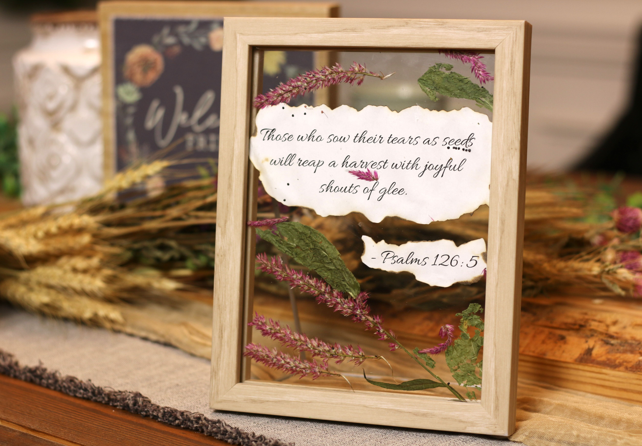 I choose dried florals—each dried by hand—that visually echo the heart of the Scripture. -
