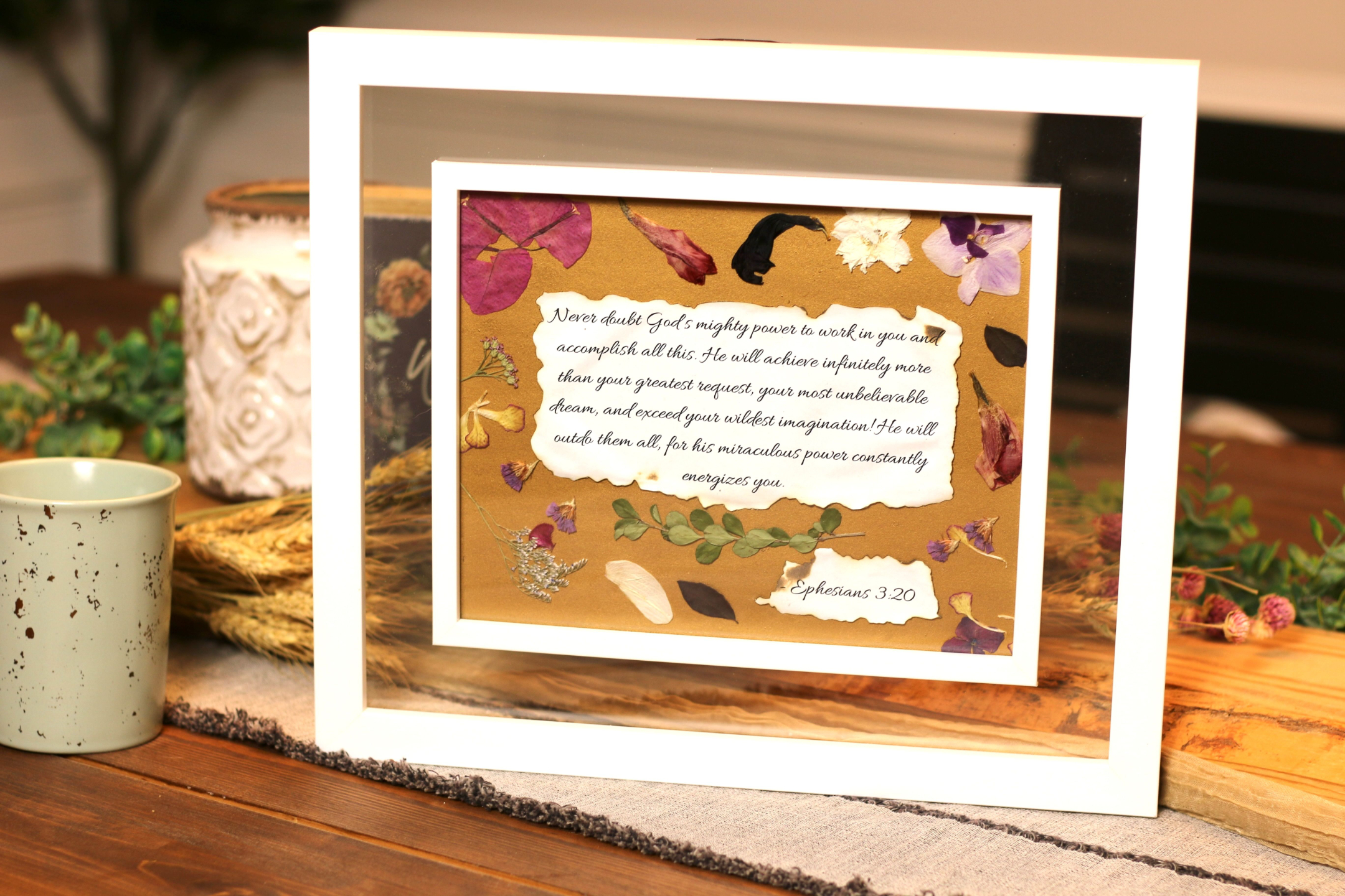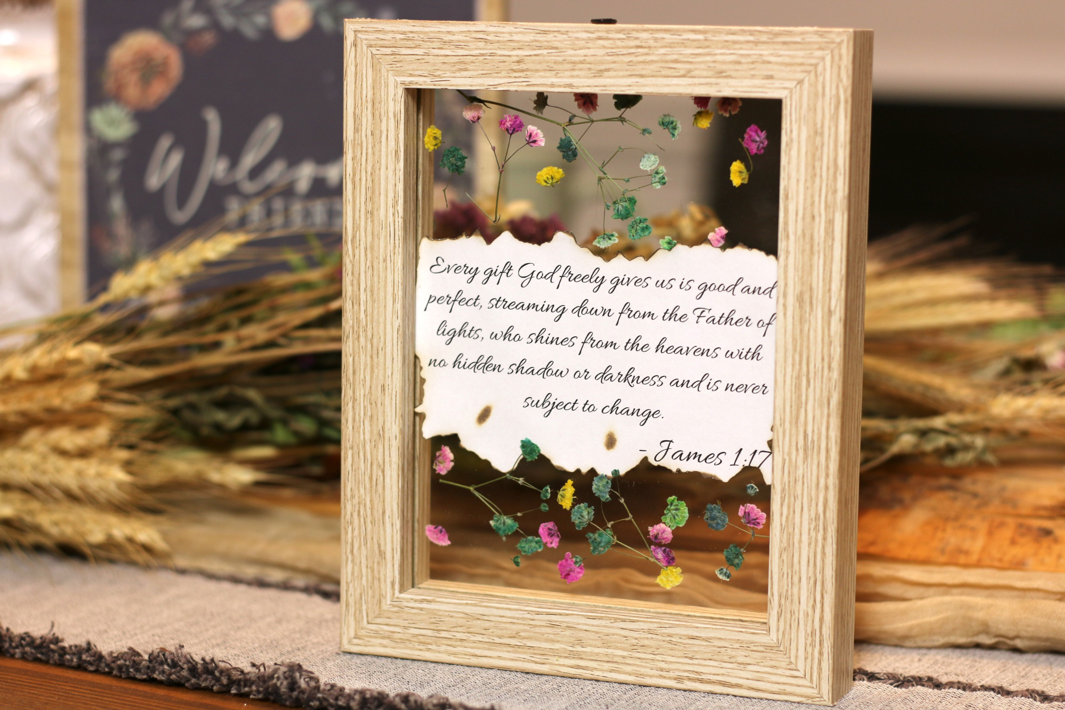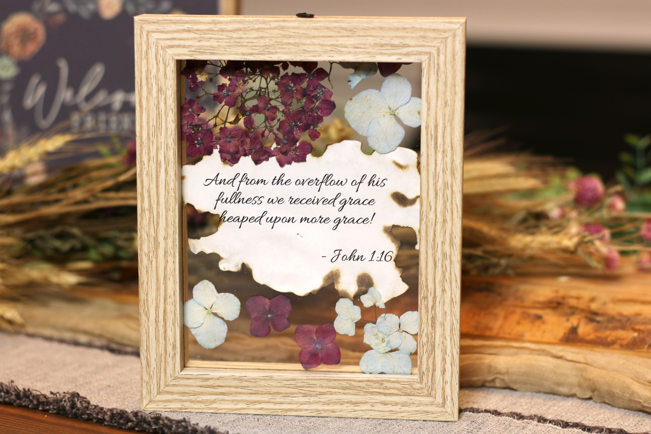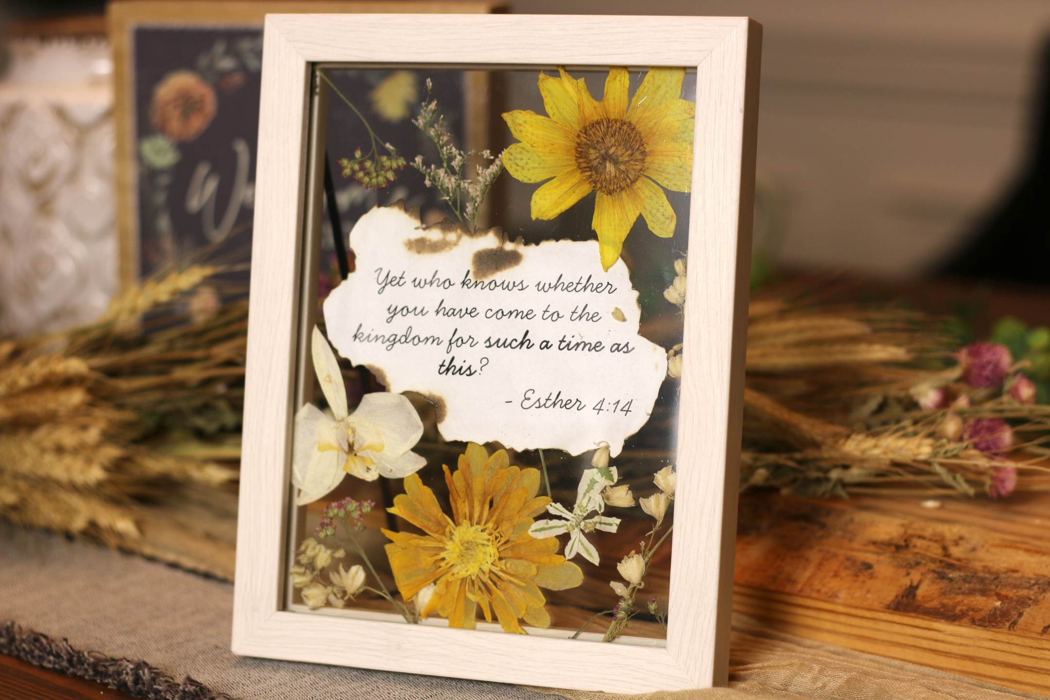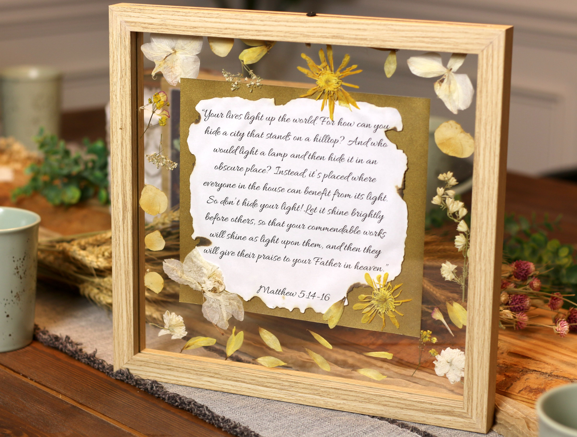 The preserved florals—carefully dried from fresh blooms—age gracefully over time, mirroring the timeless beauty of the truth they surround.